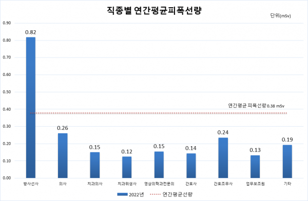 직종별 연간 평균 피폭선량은 방사선사가 0.82mSv로 가장 높고 의사 0.28mSv, 간호조무사가 0.24mSv로 그 뒤를 이었다.