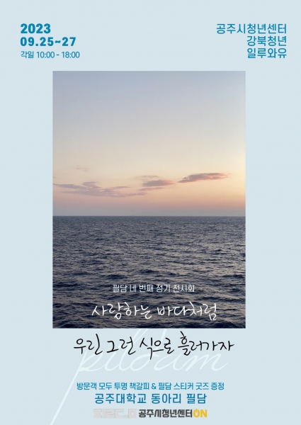 ‘사랑하는 바다처럼 우린 그런 식으로 흘러가자’라는 이번 전시회는 동아리 필담의 네 번째 정기전시회로 공주시청년센터와 연계해 마련됐으며 창작시 22점이 전시된다.