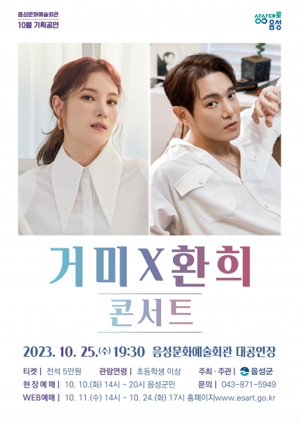 이번 공연은 우리나라를 대표하는 가수 거미와 환희가 출연하는 라이브 콘서트로 두 가수의 다양한 히트곡과 명곡들로 구성해 음성군민들에게 감동의 시간을 선사할 예정이다.