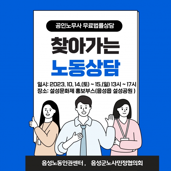 찾아가는 무료 노동상담은 10월 14일~15일 오후 1시에서 오후 5시까지, 설성문화제 홍보관에서 진행되며 근로계약서와 임금명세서를 가지고 오면 보다 정확한 상담을 받을 수 있다.