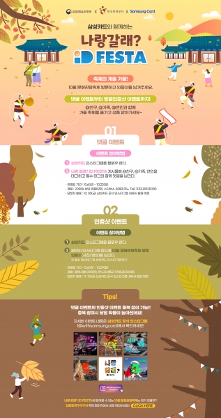 [세종타임즈] 문화체육관광부와 한국관광공사는 삼성카드와 공동으로 가을 지역축제 방문 SNS 이벤트 ‘나랑 갈래? iD FESTA’를 6일부터 29일까지 진행한다.