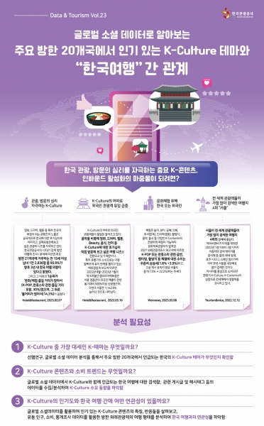 공사 심홍용 관광컨설팅팀장은 “글로벌 소셜분석을 통한 외국인 관광객의 관심사 및 선호도 파악은 맞춤형 마케팅 전략 수립을 위한 필수 요소이며 본 보고서에 실린 K-컬처 관련 분석 결과가 전략 수립, 나아가 한국 관광 활성화를 위해 적극 활용되기를 기대한다”고 밝혔다.