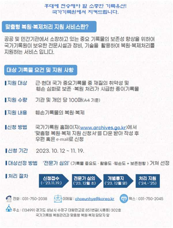 맞춤형 복원·복제 서비스 신청 기간은 10월 12일부터 11월 19일까지이며 보존 가치가 있고 국가적으로 중요한 기록물이라면 개인, 민간기관, 공공기관 등 누구나 신청 가능하다.