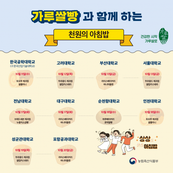 농식품부는 천원의 아침밥 참여대학 중 희망대학 10개교에 대해 중간고사 기간인 10월 11일부터 20일 사이에 인근 지역제과점에서 만든 가루쌀빵을 제공한다.