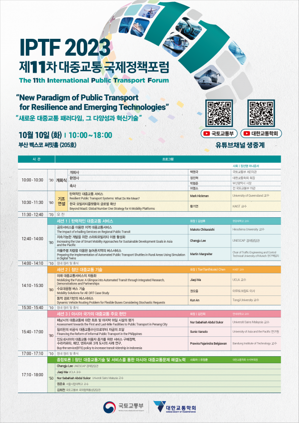 “새로운 대중교통 패러다임, 그 다양성과 혁신기술”이라는 주제로 열리는 이번 포럼에서는 탄력적인 대중교통서비스, 첨단 대중교통기술, 아시아 국가의 대중교통 주요 현안 등 3개 섹션별로 발표와 토론을 진행한다.