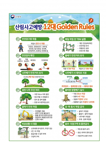 아울러 기존 산림사업 안전관리 설명서를 안전사고가 자주 발생하는 고위험작업 중심으로 개정하고 산림사업 시 반드시 지켜야 할 12대 안전 수칙을 그림 자료로 만들어 제공함으로써 산림사업 근로자가 안전사고 예방법을 쉽고 빠르게 이해할 수 있도록 했다.