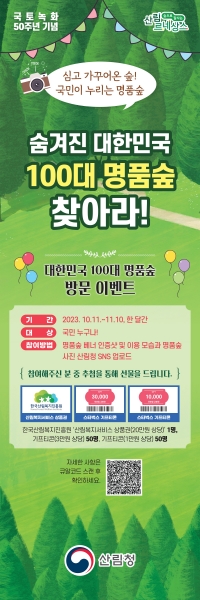 대한민국 100대 명품숲 목록과 방문 이벤트에 관한 자세한 사항은 ‘산림청 누리집 ’ 행정정보 ’ 알림정보 ’ 알립니다’에서 확인할 수 있다.