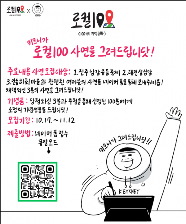 문체부와 지역문화진흥원은 ‘키크니’ 작가와 함께 진주남강유등축제, 안동하회마을, 대전성심당 등 ‘로컬100’에 얽힌 국민의 사연을 그림으로 그려주는 ‘키크니가 로컬100 사연을 그려드립니닷’ 행사도 진행한다.
