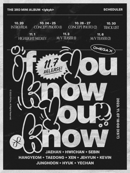컴백 카운트다운에 돌입한 오메가엑스의 ‘iykyk’는 11월 7일 오후 6시 각종 온라인 음원사이트를 통해 공개된다.