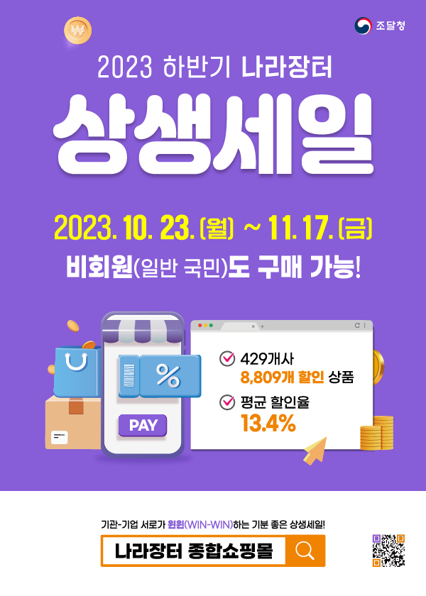 [세종타임즈] 조달청은 조달기업의 판로를 지원하고 수요기관에게 예산절감의 기회를 제공하기 위한 ‘2023년 하반기 나라장터 상생세일’을 오는 10월 23일부터 11월 17일까지 한 달간 개최한다.