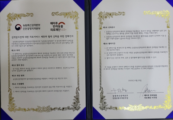 [세종타임즈] 농림축산검역본부는 검역본부 소속 검역탐지견에 대한 의료서비스 제휴와 상호 협력 강화를 위해 ‘해마루 반려동물 의료재단’과 10월 23일 업무협약을 체결했다.