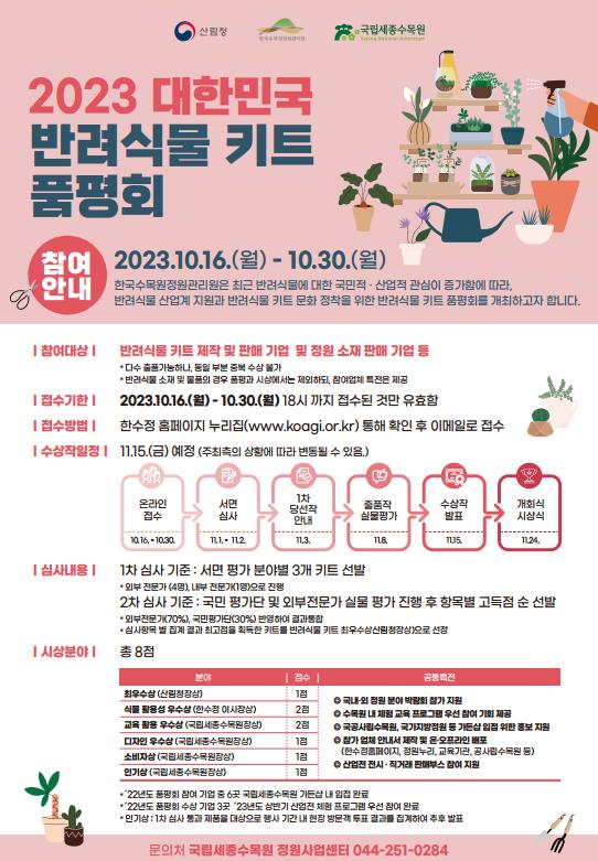 [세종타임즈] 한국수목원정원관리원은 오는 10월 30일까지 ‘2023 대한민국 반려식물 키트 품평회’ 참여기업을 모집한다.