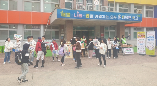 [세종타임즈] 공주시는 아동 비만 예방관리 사업 일환으로 ‘함께해요 비만제로’ 아침밥 먹기 캠페인을 지난 24일 공주중동초등학교에서 실시했다.