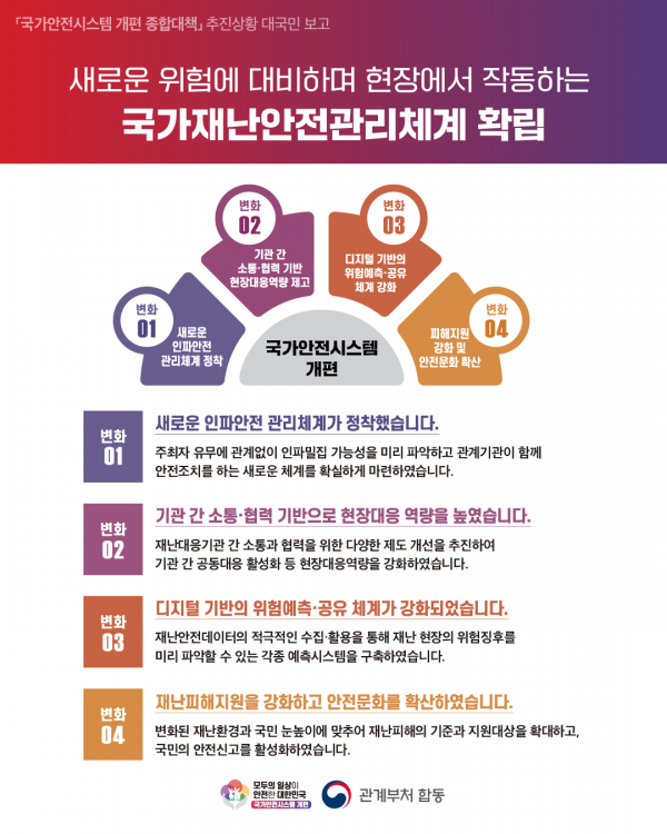 [세종타임즈] 행정안전부는 오늘 지난 10개월간의 국가안전시스템 개편 추진 경과와 달라진 점, 그리고 향후 추진이 필요한 과제 등‘국가안전시스템 개편 종합대책’추진상황을 발표했다.