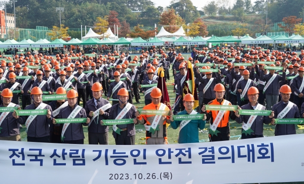 이날 결의대회는 산림기능인들의 화합과 친목을 도모하고 자긍심을 높이기 위해 열린 ‘제3회 전국산림기능인 한마음 체육대회’에 앞서 진행됐으며 결의문에는 산림사업장 위험을 예방하고 숲의 혜택을 온전히 누리기 위해 산림 안전을 최우선 가치로 삼으며 일상생활에서 산림 안전 문화를 실천하고 산림사업장 안전을 위해 스스로 안전수칙을 준수하며 모두가 산림 안전의 주체라는 인식을 갖고 산업재해 예방을 위해 지속적으로 노력할 것을 다짐하는 내용이 담겼다.