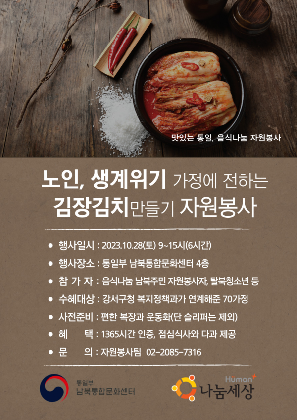 [세종타임즈] 통일부 남북통합문화센터는 10월 28일 맛있는 통일 음식나눔 자원봉사‘독거노인 등 생계위기 가정에게 전하는 김장김치’행사를 개최한다.