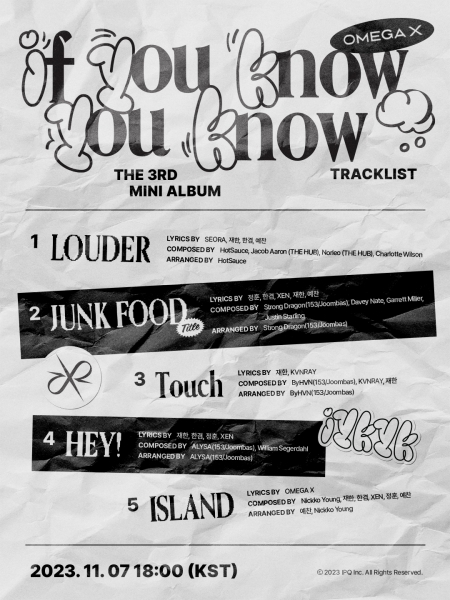 오메가엑스는 30일 자정 공식 SNS 채널을 통해 세 번째 미니앨범 ‘iykyk’의 트랙리스트를 공개했다.