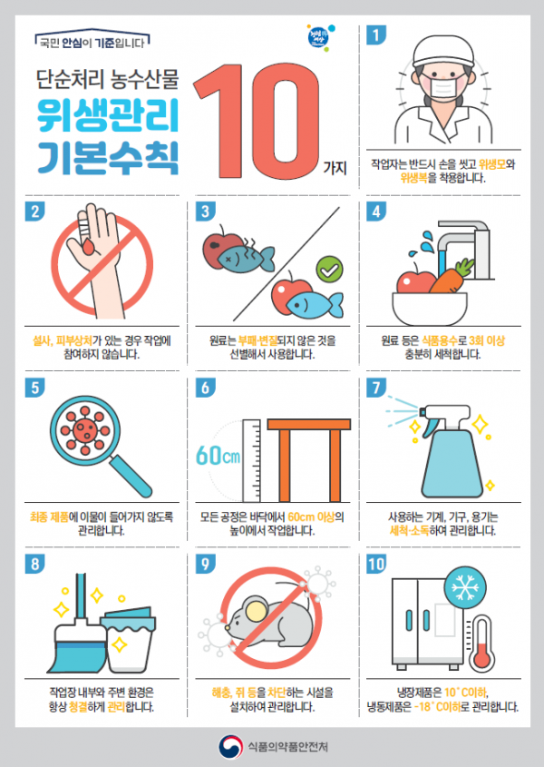 참고로 지난해부터 올해 6월까지 단순처리 농·수산물 생산업체 772곳을 점검하고 위생관리에 미흡한 점이 확인된 업체에 대해서는 현장에서 개선 조치와 재발 방지 교육을 실시했으며 향후에도 주기적으로 위생점검을 할 계획이다.