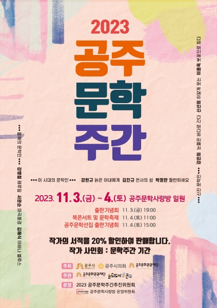 ‘2023 공주문학주간’은 공주시 반죽동에 위치한 공주문학사랑방 일원에서 진행되며 첫째 날 오후 7시 출판기념회를 시작으로 다음날 오전 11시부터 오후 8시까지 다양한 프로그램으로 진행된다.