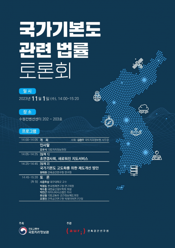 [세종타임즈] 국토교통부 국토지리정보원은 국무조정실 산하 건축공간 연구원과 공동으로 국가기본도를 통해 현실 세계의 모든 데이터와 지도를 연결하는 ‘디지털 대한민국’을 실현할 수 있도록, 국가기본도의 새로운 정의를 담은 관련 법 개정의 필요성을 논의하는법률 토론회를 개최한다고 밝혔다.