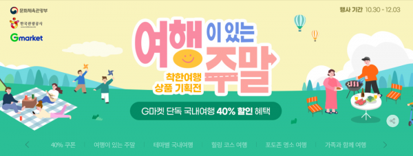 이번 기획전에서는 전문가 심사를 통해 국내 여행사들이 제안한 40여 개 여행상품을 선정했으며 온라인 마켓플레이스 G마켓 내 ‘착한여행 상품기획전’코너에서 30일 오전 0시부터 40% 할인쿠폰을 받아 여행상품들을 구매할 수 있다.