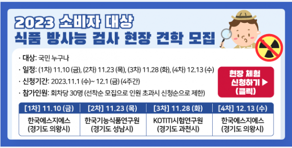 체험 프로그램은 총 4회, 120명을 대상으로 진행할 예정이며 식약처가 지정한 민간 식품 방사능 검사기관에서 실시할 계획이다.