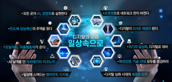이어서 오후에는, 디지털 혁신, 일상 속으로 다가올 디지털 미래를 주제로 생성형 인공지능, 차세대 통신, 융합보안, 양자, 도심항공교통, 미래자동차 등 분야별 산업 동향, 미래 준비 현황 등을 논의한다.