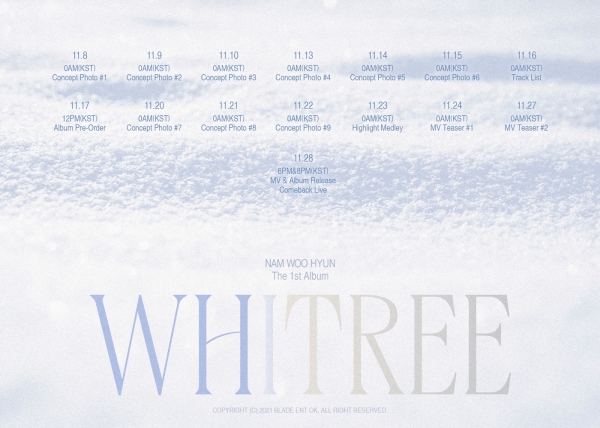 남우현은 6일 0시 공식 SNS 채널을 통해 첫 솔로 정규 앨범 ‘Whitree’의 스케줄러를 공개했다.
