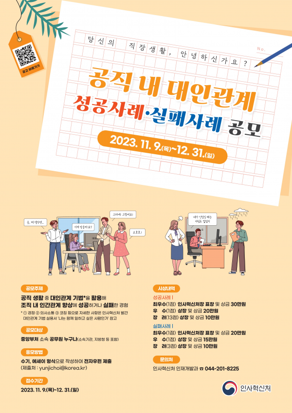 인사혁신처는 출근하고 싶은 직장, 행복한 일터 조성을 위해 중앙부처 공무원을 대상으로 ‘공직 내 대인관계 성공사례·실패사례 공모’를 실시한다고 9일 밝혔다.