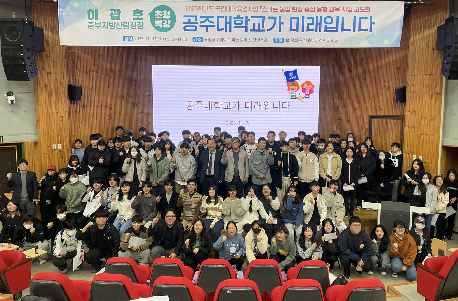 [세종타임즈] 국립공주대학교 산림과학과는 2023학년도 국립대학 육성사업 ‘스마트 농업 현장중심 융합 교육 사업 고도화’의 일환으로 이광호 중부지방산림청장을 초청하여 특강을 지난 7일 산업과학대학 컨벤션홀에서 진행했다고 9일 밝혔다.