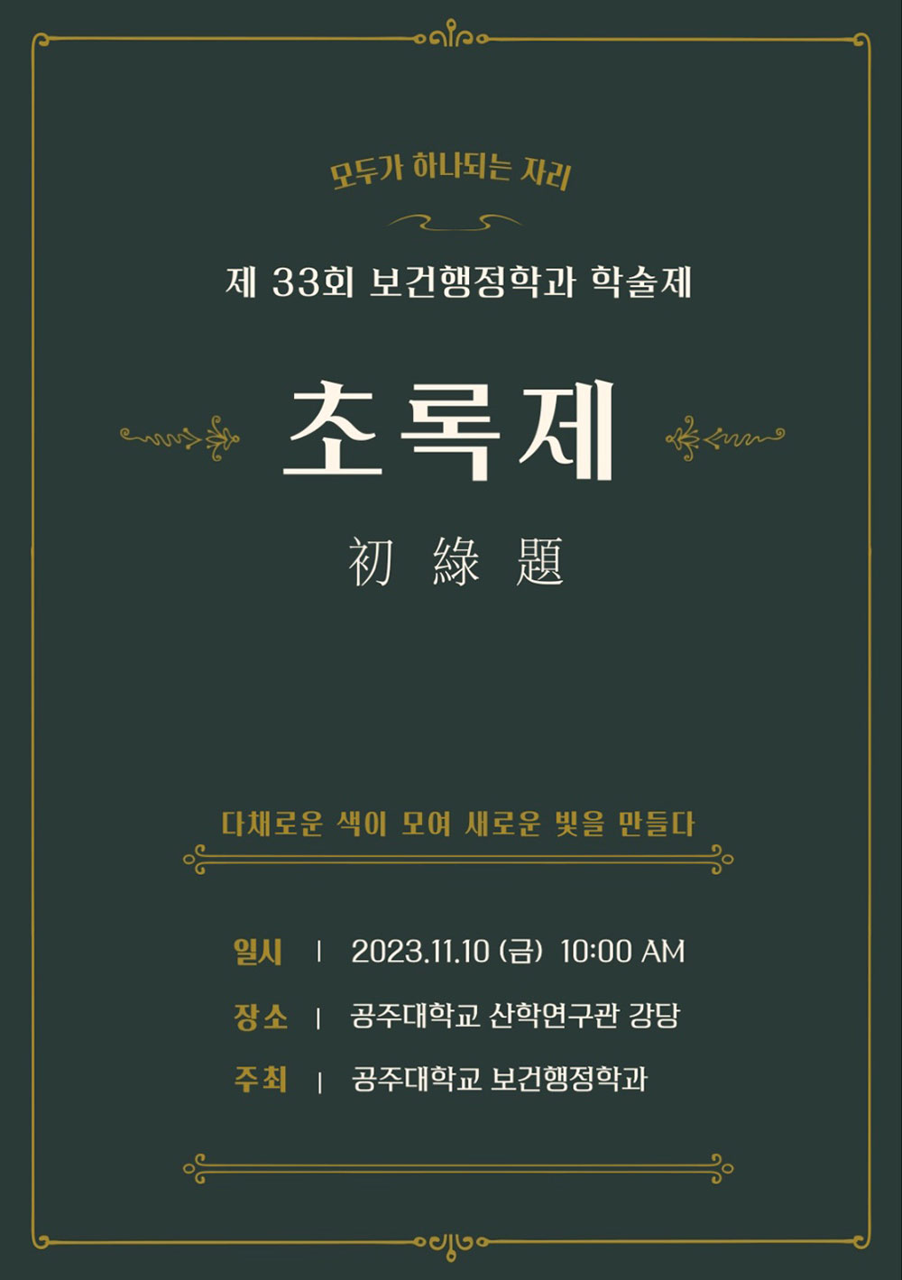 [세종타임즈] 국립공주대학교 보건행정학과는 오는 10일 산학연구관 강당에서 제33회 보건행정학과 학술제인 초록제(부제: 다채로운 색이 모여 새로운 빛을 만들다)를 개최한다.