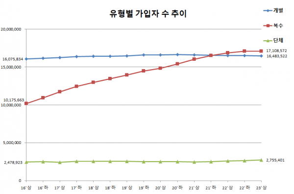 가입자 유형별로는 복수 가입자 17,108,572, 개별 가입자 16,483,522, 단체 가입자 2,755,401 순으로 집계됐다.