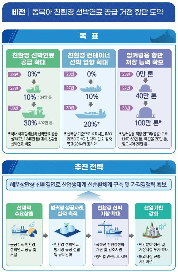 해양수산부는 이번 대책을 통해 2030년까지 친환경 선박연료 공급 비중을 30%까지 확대하고 국내 항만에 입항하는 친환경 연료 추진 컨테이너 선박의 비율을 20%까지 확대하며 친환경 선박연료의 항만 저장 능력을 100만 톤 확보하는 것을 목표로 한다.