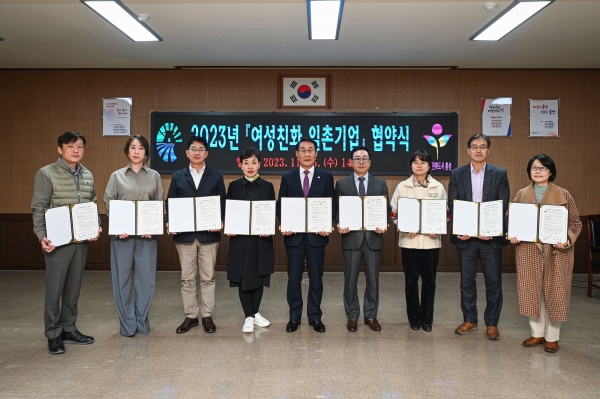 이날 협약식에서는 결성요양원 광천주간보호센터 농업회사법인㈜화천 삼화제도 ㈜솔뫼에프엔씨 양지재활주간보호센터 ㈜이에스테크인터내셔 ㈜제이원메딕스와 여성친화 일촌기업 협약을 체결했다.