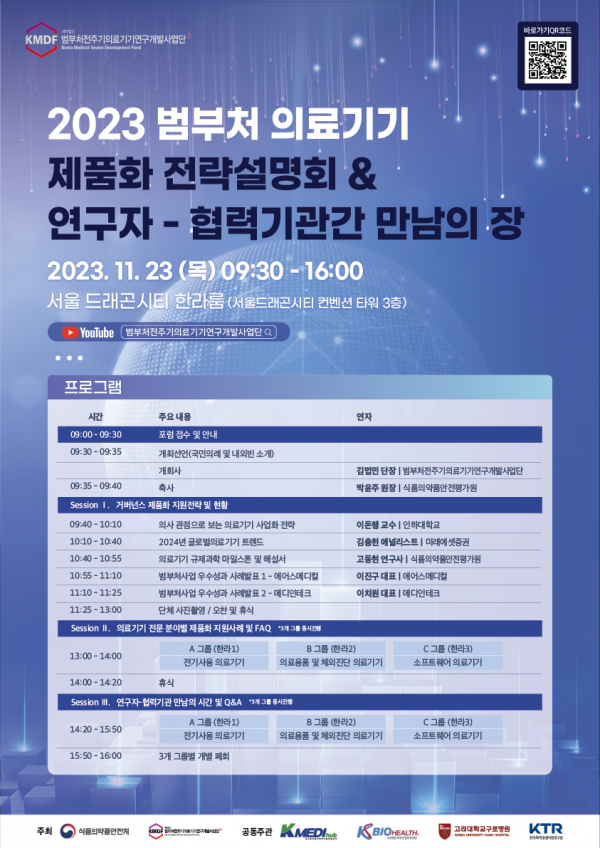 [세종타임즈] 식품의약품안전처는 범부처전주기의료기기연구개발사업단과 함께 연구자와 협력기관간 만남의 장을 마련하고 의료기기 제품화 전략을 안내하기 위해 오는 11월 23일 ‘2023년 범부처 의료기기 제품화 지원 거버넌스 통합포럼’을 서울드래곤시티 컨벤션에서 개최한다고 밝혔다.
