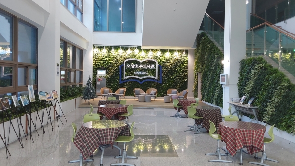 오창호수도서관 1층~5층의 로비와 엘리베이터 앞 벽면과 창가를 이용해 217㎡의 식재 공간을 조성하고 산호수 등 공기정화 관엽식물 10,272본을 식재해 실내 녹색공간을 조성했다.