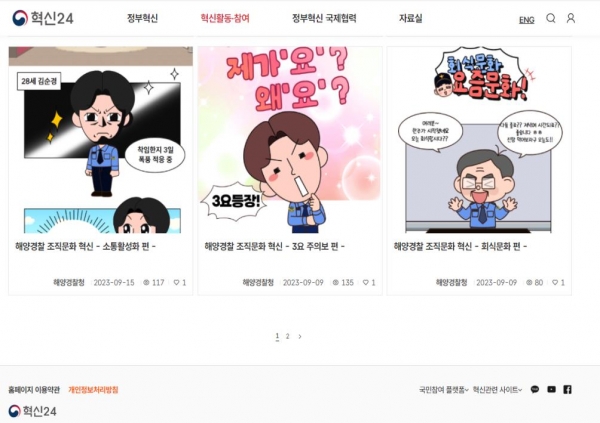 해양경찰청에서도 매월 10일 혁신 소통의 날을 운영, 함정·파출소 등 현장 직원들의 접근성이 좋은 해양경찰교육원 메타버스 캠퍼스를 통해 전국 혁신파이어니어와의 혁신 소통의 시간을 가졌고 업무 비효율로 개선 필요 사항 또는 정부혁신 이슈에 대해 매월 주제를 지정, 혁신아이디어 214건 발굴 및 41건 우수아이디어 선정 등 해양경찰 일하는 방식 및 조직문화 개선에 앞장서고 있다.