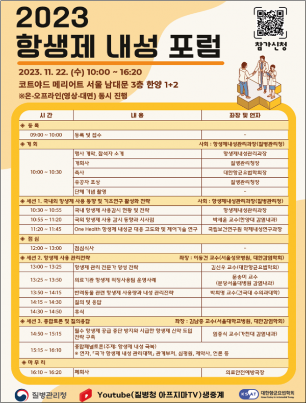 [세종타임즈] 질병관리청은 ‘세계 항생제 내성 인식주간’을 맞아 대한항균요법학회와 함께, 11월 22일에 코트야드 메리어트 서울 남대문에서 ‘2023 항생제 내성 포럼’을 개최했다.