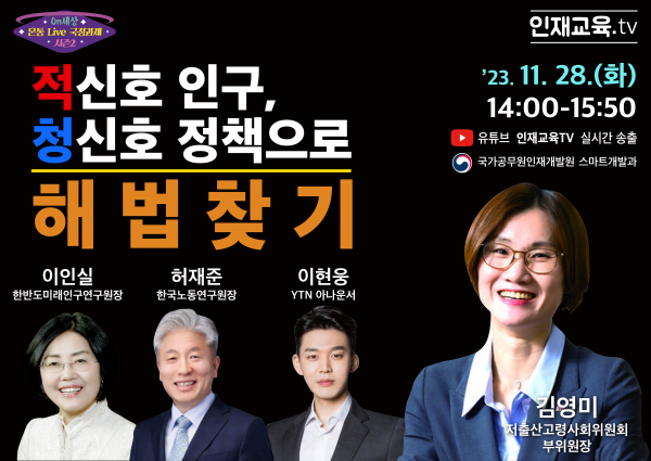 국가공무원인재개발원은 오는 28일 ‘적신호 인구, 청신호 정책으로 해법 찾기’라는 주제로 ‘온통 실시간 국정과제’ 유튜브 공개강좌를 진행한다고 27일 밝혔다.