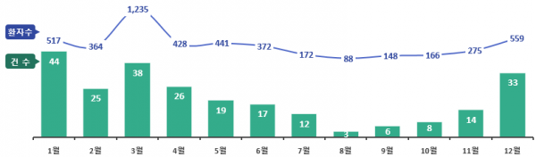 최근 5년간 노로바이러스 식중독 발생 현황을 분석한 결과 총 245건이 발생했으며 특히 겨울철인 12월부터 이듬해 2월까지 발생한 식중독 건수는 102건으로 전체의 약 42%를 차지하는 것으로 나타났다.