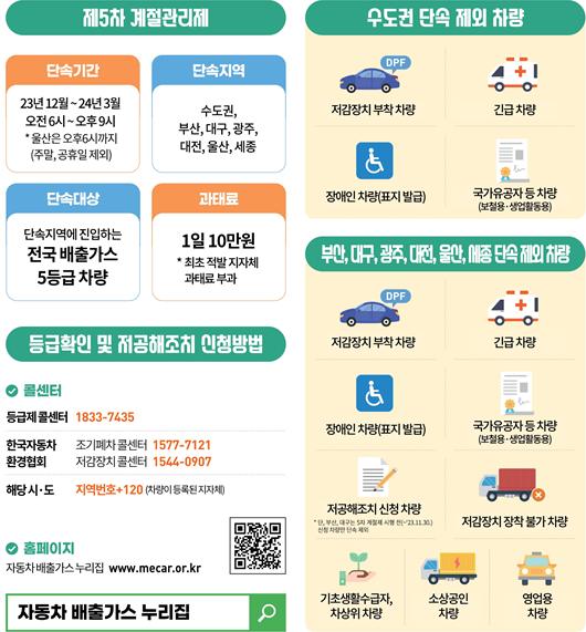 단속 지역은 서울, 인천, 경기, 부산, 대구, 광주, 대전, 울산, 세종이며 12월~3월 4개월 동안 저공해 조치를 하지 않은 5등급 차량이 해당 지역에서 운행하다 적발될 경우 1일 10만원의 과태료가 부과된다.