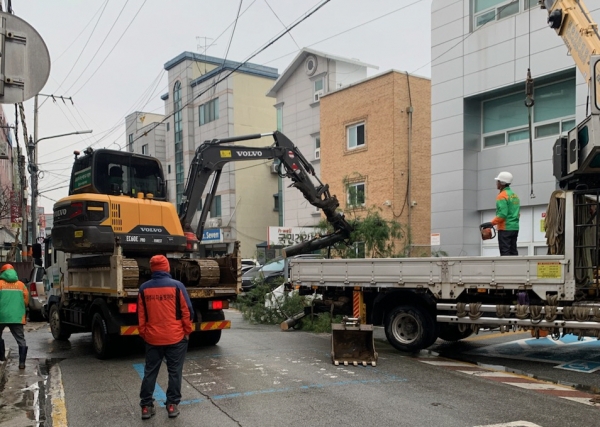 자율방재단원들은 크레인 등의 장비를 동원해 그동안 신관동 행정복지센터에 접수된 위험목을 정비하며 안전사고가 발생하지 않도록 조치했다.