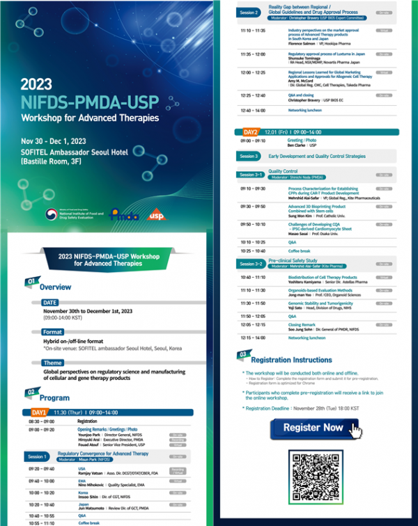 ‘첨단바이오의약품의 제조 및 허가에 관한 글로벌 규제과학 관점’이라는 주제로 열리는 이번 워크숍에서는 한·미·일·유럽 규제현황 글로벌 제약사의 세포·유전자치료제 허가 사례 초기 제품개발이나 비임상 단계에서 안전성 평가 및 품질관리전략 등 최신 첨단바이오의약품 정보를 공유하고 글로벌 제품개발 전략에 대해 논의한다.