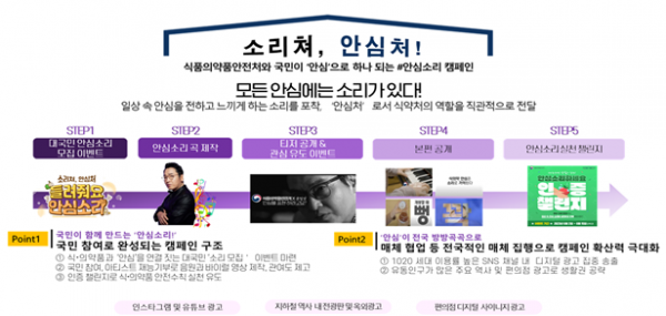 일상 속 식품, 의약품 안전을 지킬 때 나는 소리를 국민 참여 댓글로 모집한 후 최종 7개 소리를 선정, 이를 활용해 감각적인 음원 ‘안심 송’과 영상을 제작해 확산했다.