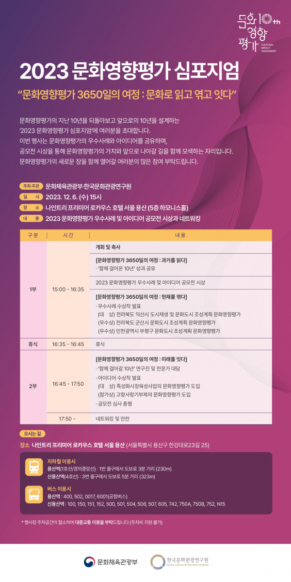 아울러 이번 행사에서는 문화영향평가 10주년을 계기로 지난 9월부터 10월까지 진행한 ‘2023 문화영향평가 우수사례 및 아이디어 공모전’ 시상식도 개최한다.