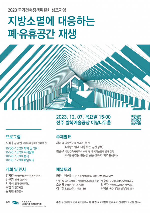 국가건축정책위원회와 국토교통부, 전라북도은 12월 7일 오후 전주 팔복예술공장에서 “지방소멸에 대응하는 폐·유휴공간 재생 심포지엄”을 개최한다고 밝혔다.