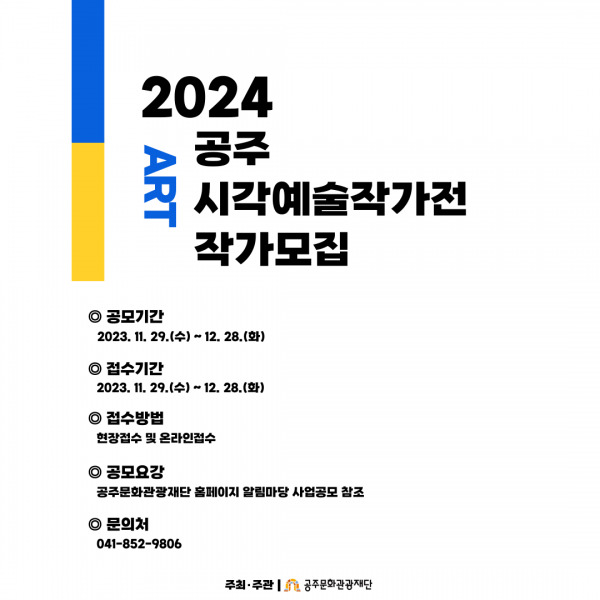[세종타임즈] 공주문화관광재단은 지역 예술인 역량 강화와 전시 기회 확대를 위해 다음 달 28일까지 ‘2024 공주 올해의 작가전’, ‘2024 공주 차세대 작가전’, ‘2024 공주 올해의 사진작가전’에 참여할 시각 예술인을 모집한다.