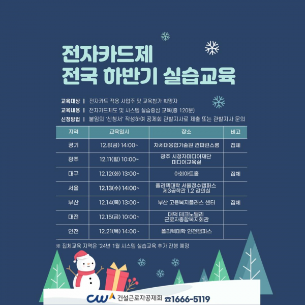 [세종타임즈] 건설근로자공제회는 12월 8일을 시작으로 전국 7개소에서 약 600명의 건설 사업주를 대상으로 ‘찾아가는 전자카드 실습교육’을 실시한다고 밝혔다.