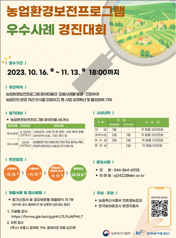 농식품부는 이번 경진대회를 농업환경보전프로그램 참여 마을의 다양한 개선·모범 실천사례와 우수 사업성과를 발굴해 공유하고 이를 통해 농업환경보전프로그램 사업추진 효과 제고 등 사업의 발전방향 마련에 활용하기 위해 실시했다.