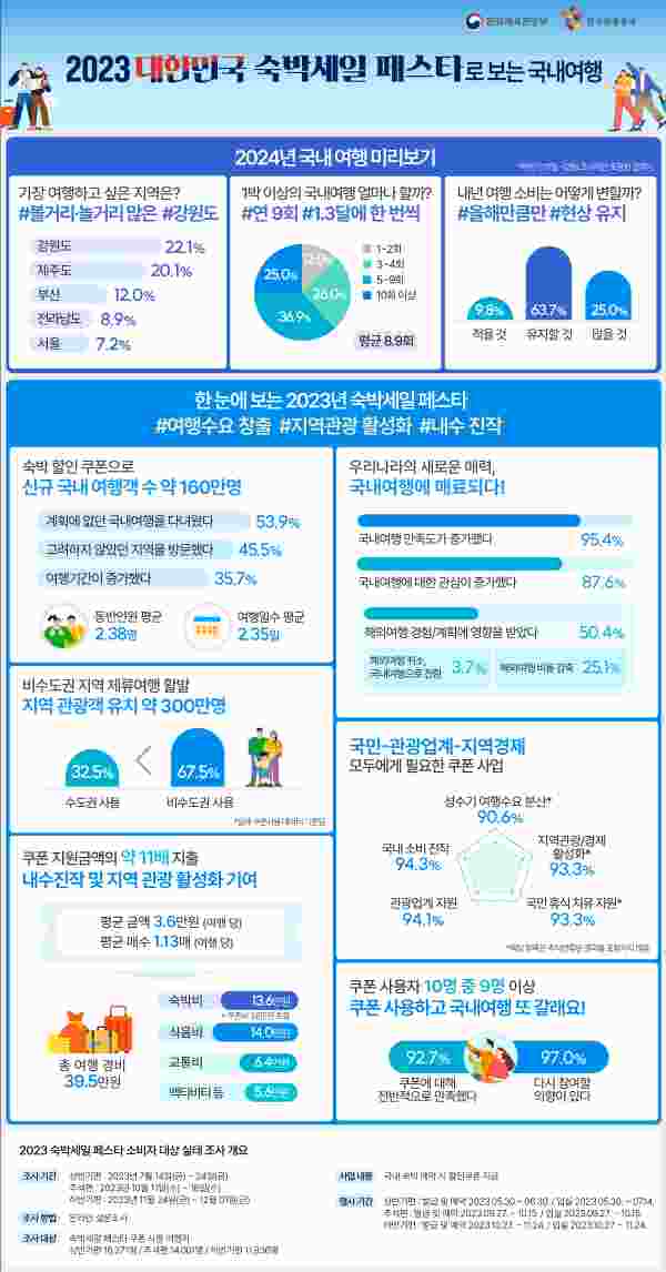 문화체육관광부와 한국관광공사가 진행한 ‘2023년 하반기 대한민국 숙박세일 페스타’ 참여자 1만 2천여명을 대상으로 여행계획을 조사한 결과, 내년도 1박 이상의 국내여행 희망 횟수는 평균 8.96회로 이는 응답자들의 최근 1년 이내 국내여행 평균 횟수보다 증가한 수치다.